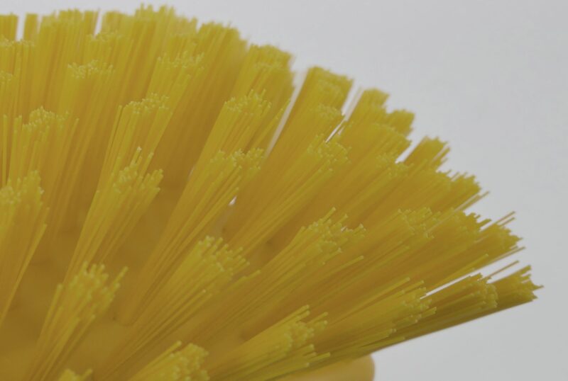As with all Deck Scrubs, these have short, stiff bristles to scrub and loosen debris on the floor. They are usually used with a cleaning solution on floors that are drained so that the solution/soil can be squeegeed up after agitation with the deck scrub.